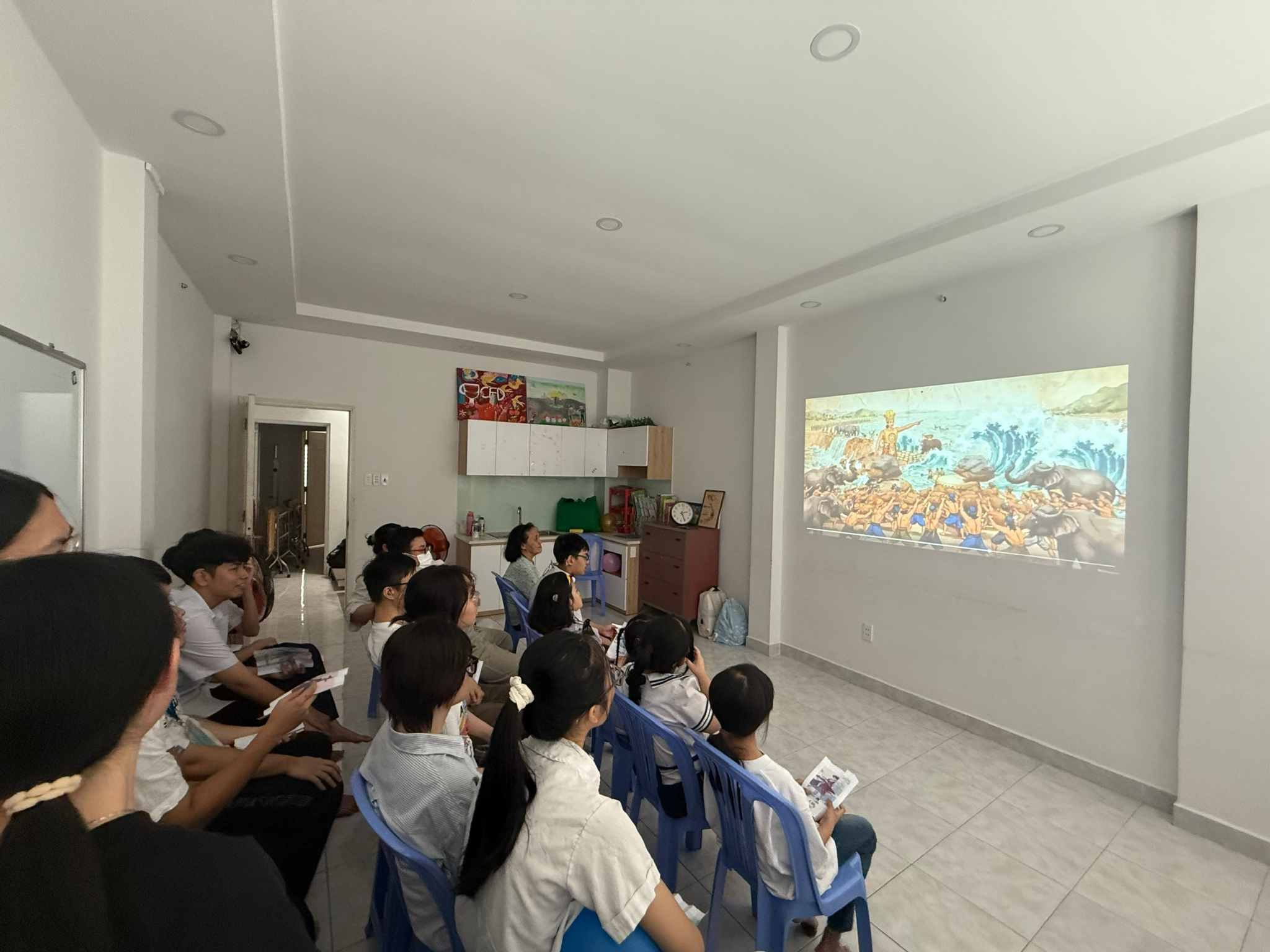 The fairy tale world of "Son Tinh - Thuy Tinh" (The God of the Mountain and the God of the Water) was recreated in a humorous and refreshing way through the children's innocence. They were not merely the audiences but directly transformed into King Hung, Princess Mi Nuong, Son Tinh, Thuy Tinh, and other characters, using handmade props like crowns and paper fans. Their natural stage improvisation and vivid expressions brought hearty bursts of laughter to the entire classroom.