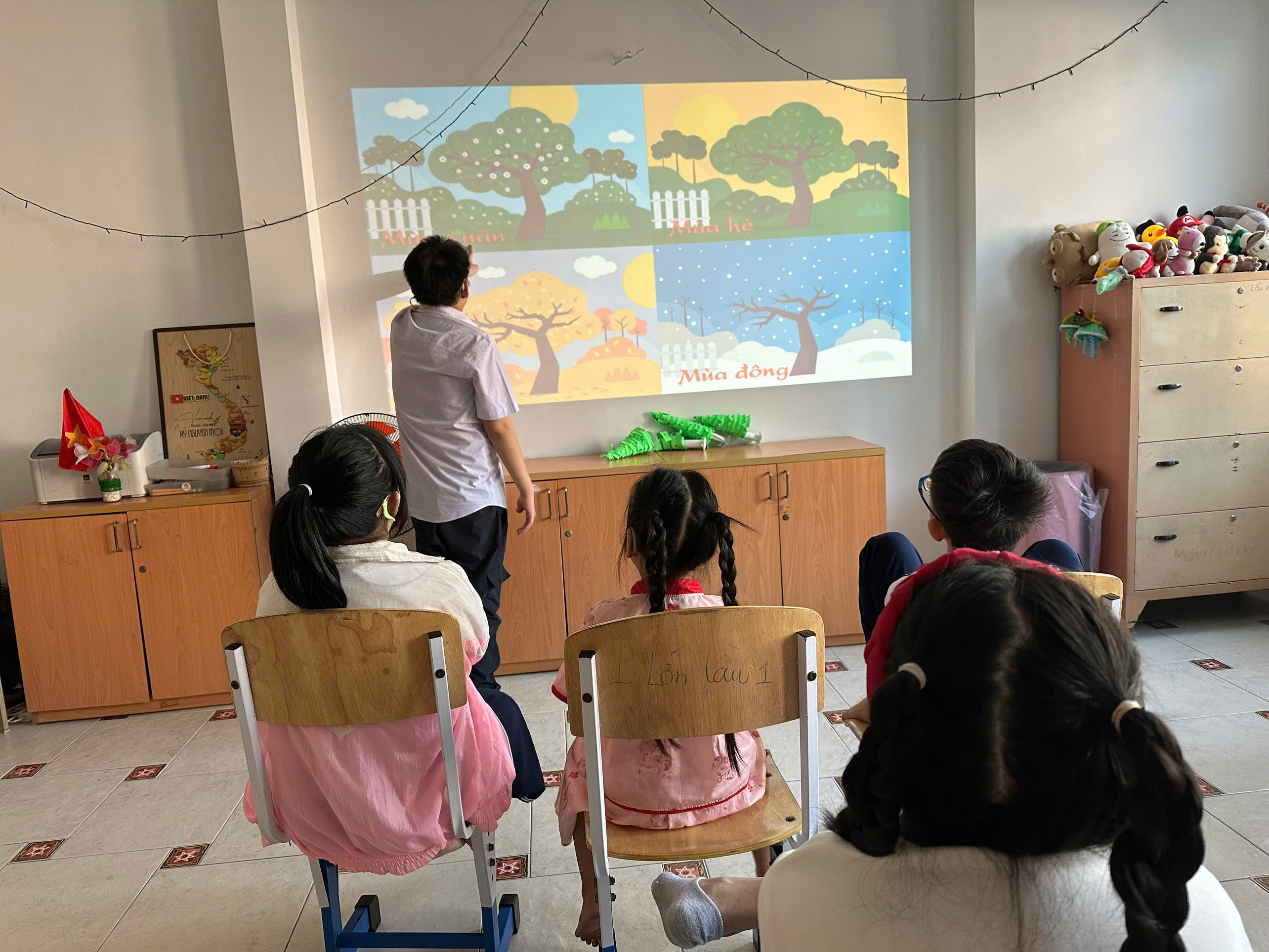 Through visual materials, group games, and hands-on activities, the students learned about familiar signs of spring such as blooming flowers, budding trees, warmer weather, and the atmosphere of family gatherings at the beginning of the year. The students eagerly shared what they loved most about spring and their wishes for the New Year.