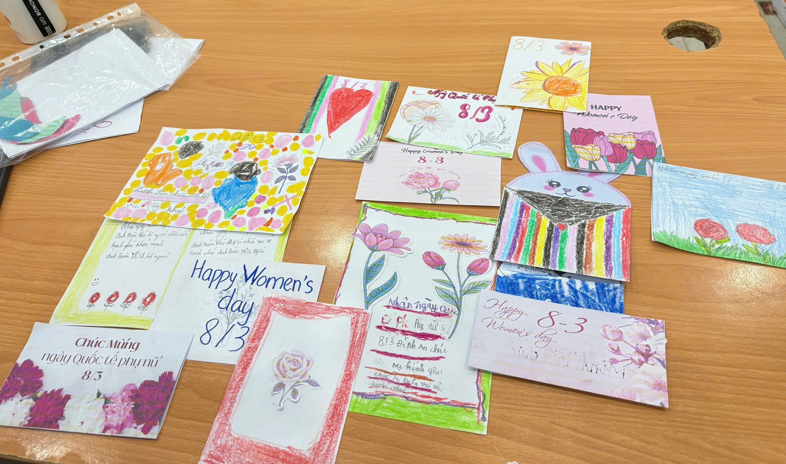 Stage 2: "Creative Hands" – Sending Love in Every Detail Leaving the energetic race track behind, the students showcased their artistic talents by designing March 8th greeting cards using only paper and colors. Every paper flower was meticulously cut, and the most heartfelt wishes were carefully handwritten for Grandmothers, Mothers, Aunts, Teachers, Sisters, and Friends.