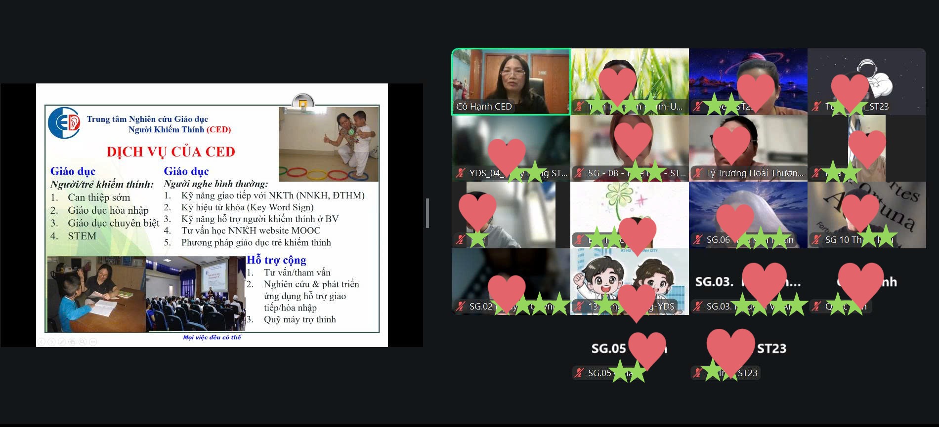 Ngày 23 và 25/3/2026, Bà Dương Phương Hạnh – Giám đốc Trung tâm Nghiên cứu Giáo dục Người khiếm thính (CED) được mời báo cáo chuyên đề “Ngôn ngữ ký hiệu” thuộc môn học “Thính lực học và Phục hồi chức năng thính giác” cho 17 sinh viên chương trình đào tạo Cử nhân Ngôn Ngữ trị liệu, Khoa Phục hồi Chức năng, Đại học Y Dược Tp.HCM.