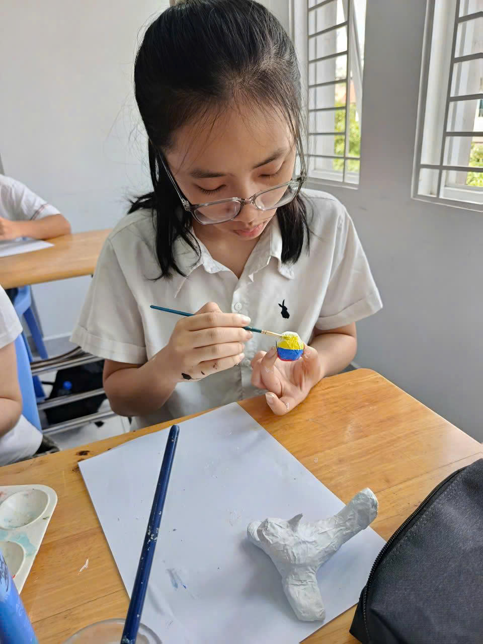 Với các nguyên vật liệu như giấy bạc, màu acrylic, kéo, keo sữa và với sự hướng dẫn tận tình của giáo viên, các bạn đã khéo léo sử dụng kỹ thuật bồi giấy. Từng sản phẩm, từng cách kết hợp màu sắc cho thấy các bạn làm rất tốt việc triển khai ý tưởng của mình thành thành mô hình thực tế.