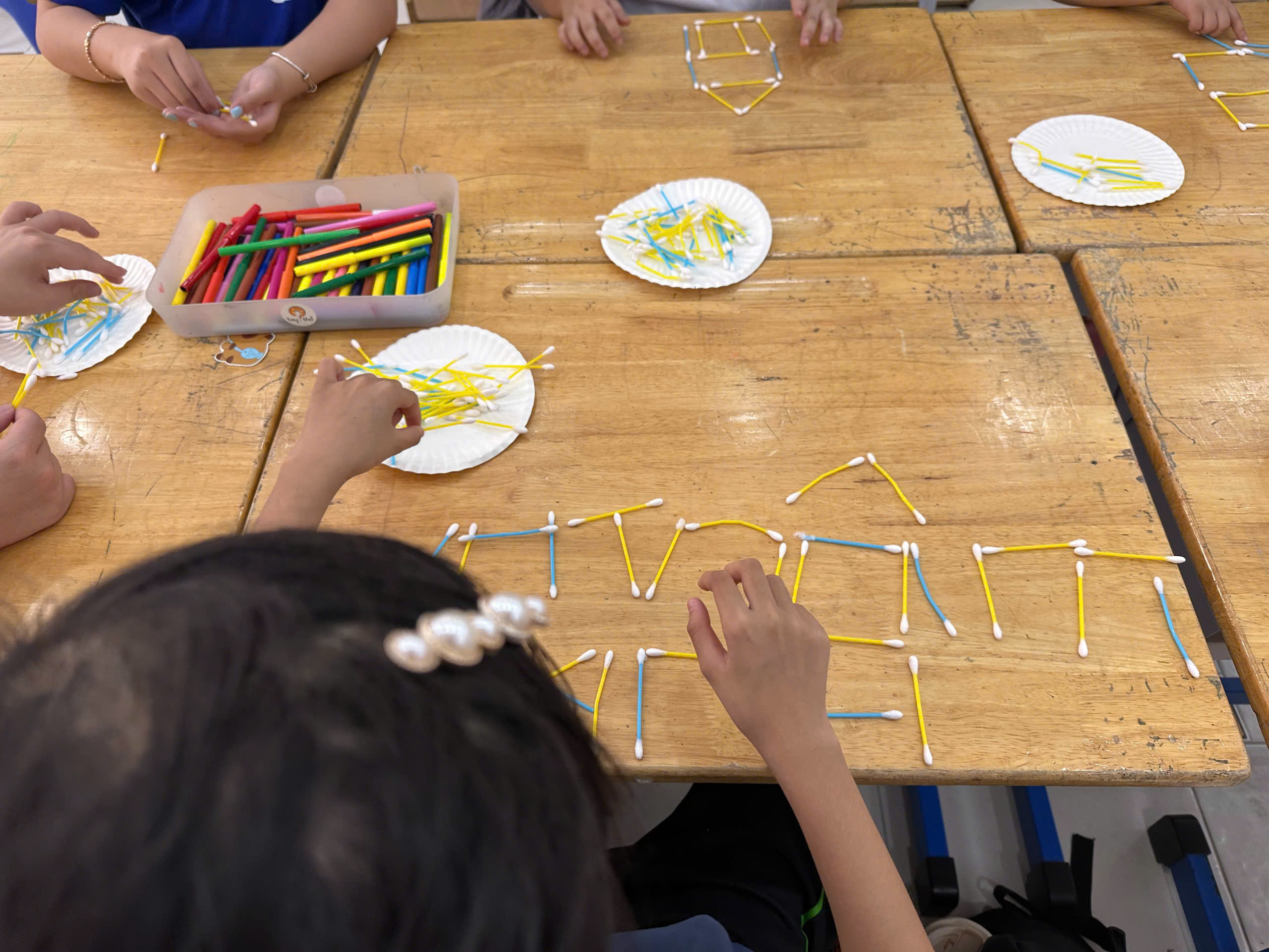 Trong tiết học, các em được hướng dẫn xếp những chiếc tăm bông thành hình ngộ nghĩnh rồi dùng bút màu, giấy vẽ để phát triển ý tưởng thành bức tranh hoàn chỉnh. Từ ngôi sao, ngôi nhà, lá cờ cho đến khung cảnh thiên nhiên, mỗi sản phẩm đều mang nét độc đáo và sáng tạo riêng.
