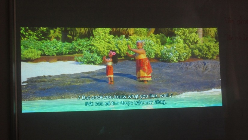 After the film, the teacher made some questions: “Who is the main character?; What are Maui and Moana’s personality?; Tell the difficulties that they get on the way to find Te Fiti’s heart; Which character do you like?... to reviewed the content and learned the lesson. Moana is brave, smart and good-hearted girl. Maui made mistake but he tried to fix it even he lost the magic hook that he love the most.