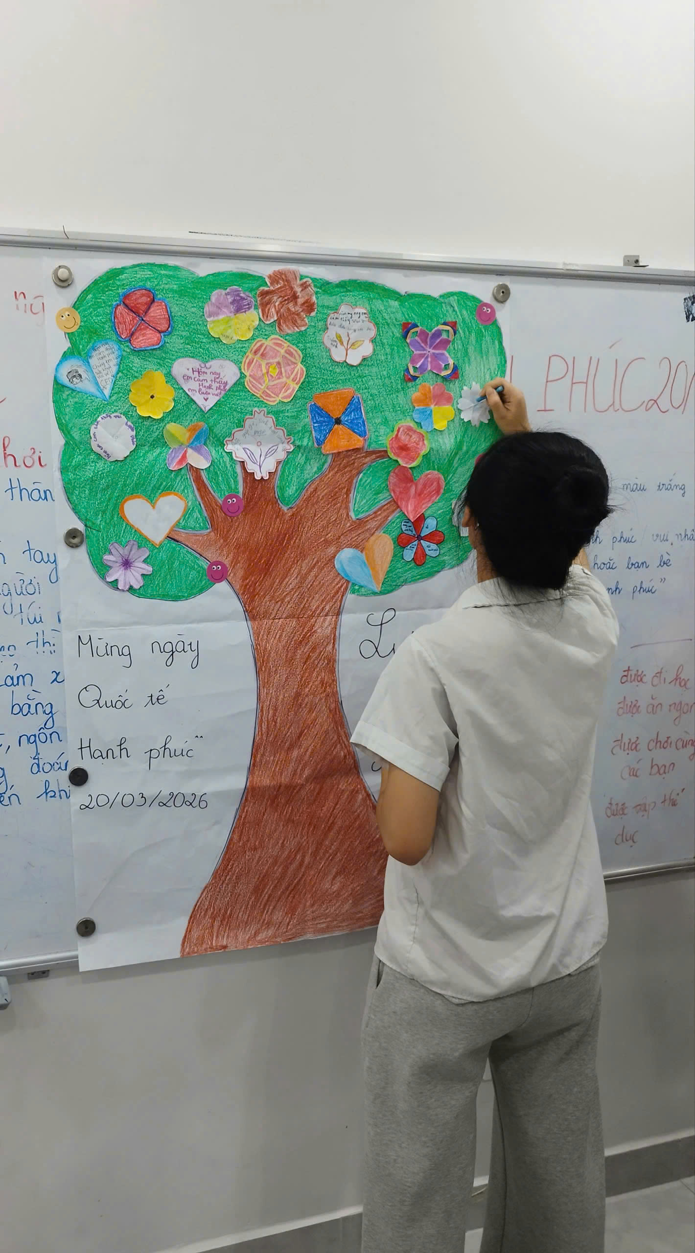 Vibrant paper flowers were hand-cut, decorated, and carefully inscribed by the students with the small joys they experienced that day. From a simple bare trunk, the "Tree of Happiness" gradually bloomed brilliantly with the colors of positive thoughts. Each flower was a short story, each line of text was a moment to cherish. Looking back at the "Tree of Happiness" together, everyone could feel that happiness sometimes starts from the simplest things - a smile, a friend, or a shared moment.