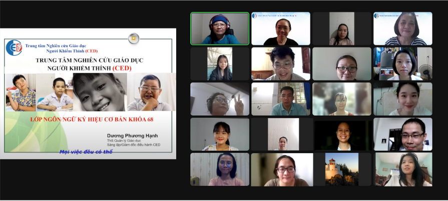 Ngày 15/05/2022, Bà Dương Phương Hạnh – Giám đốc Trung Tâm Nghiên Cứu Giáo Dục Người Khiếm Thính (CED) đã tập huấn cho 23 học viên là nhân viên xã hội, sinh viên và một số học viên làm việc trong lĩnh vực Công nghệ thông tin, Môi trường, Ngoại ngữ, Dịch thuật, Kinh tế,… về chuyên đề Ngôn ngữ ký hiệu - trình độ Cơ bản.