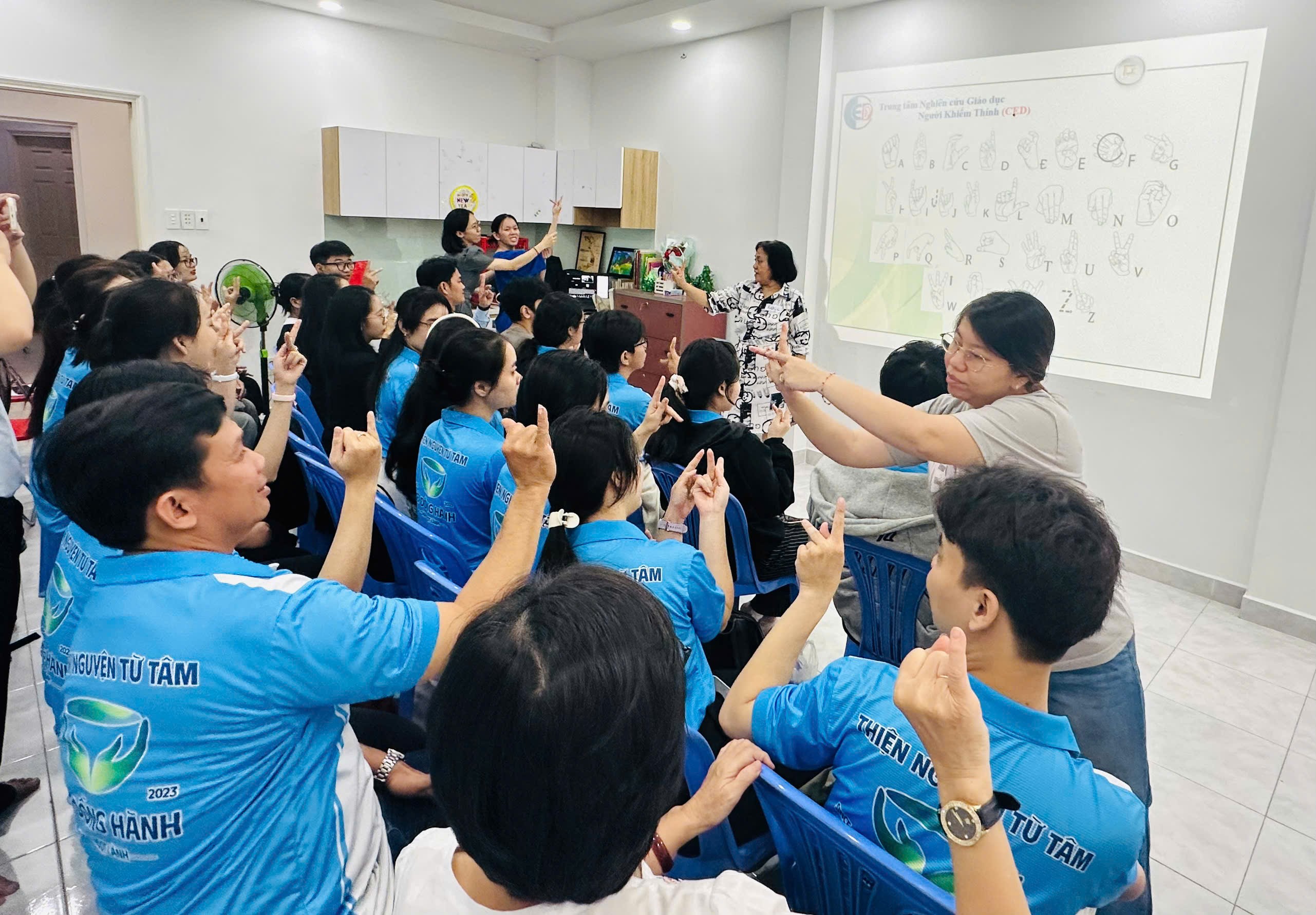 Trong khuôn khổ buổi chia sẻ, người tham dự được làm quen với bảng chữ cái, số đếm, các câu giao tiếp thông thường bằng ngôn ngữ ký hiệu, và thực hành giao tiếp với học sinh điếc.