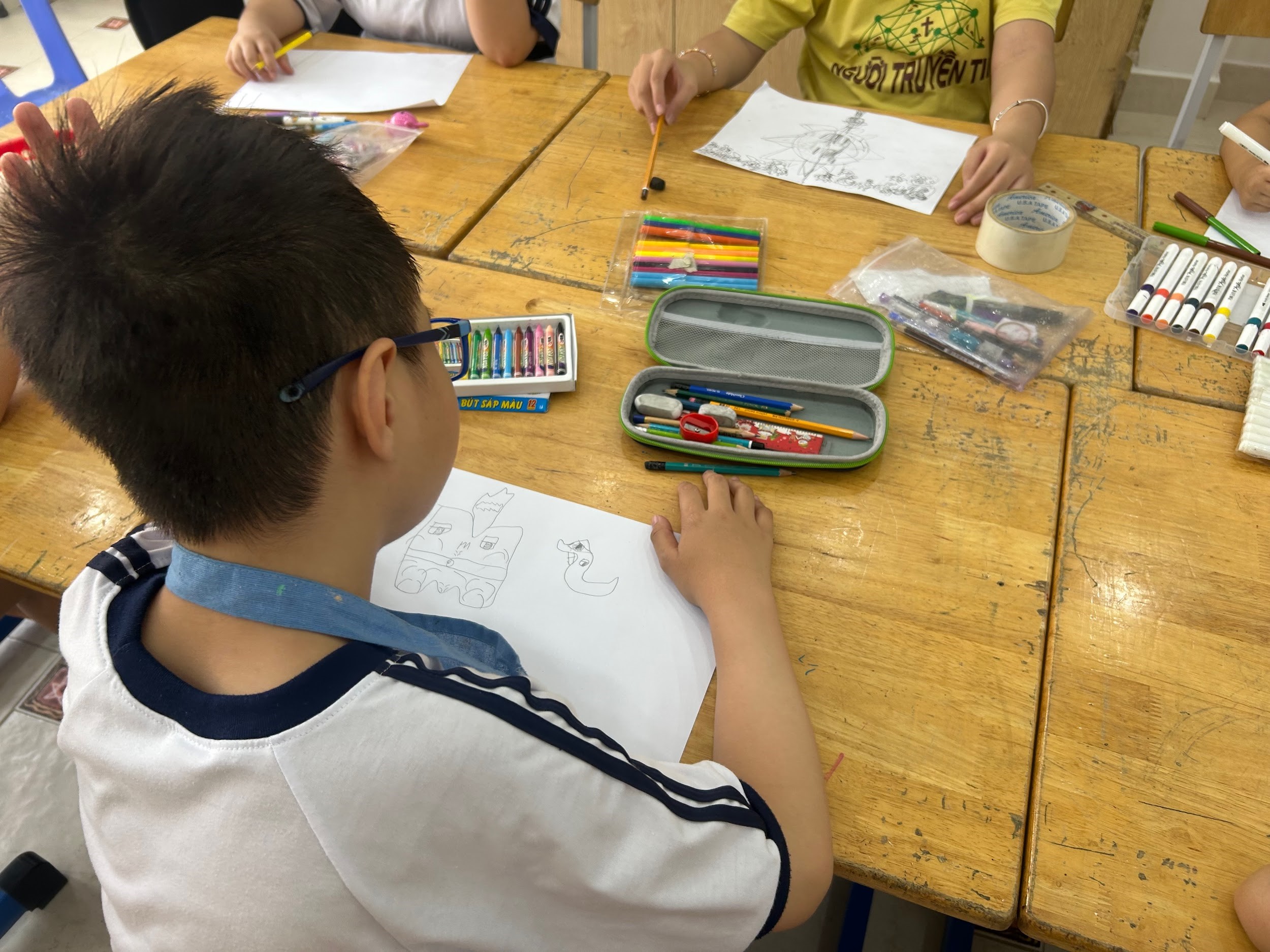 Với mục tiêu khuyến khích các em thể hiện những hoạt động thường ngày của mình bằng hình ảnh, buổi học không chỉ là dịp để các em rèn luyện kỹ năng hội họa cơ bản, mà còn là một phương tiện hữu hiệu để các em bộc lộ thế giới nội tâm và chia sẻ những khoảnh khắc đáng nhớ trong ngày của mình. Buổi học đã khơi gợi cho các em niềm yêu thích và sự tập trung cao độ khi nhớ lại và hình dung về một ngày điển hình của mình. Sử dụng đa dạng các chất liệu như bút chì và sáp màu, mỗi em học sinh đã tự do phác họa và tô điểm nên "Ngày Của Em" theo cách riêng biệt; từng nét vẽ, mảng màu đều thể hiện sự quan sát tỉ mỉ và những cảm xúc chân thật về cuộc sống thường nhật.