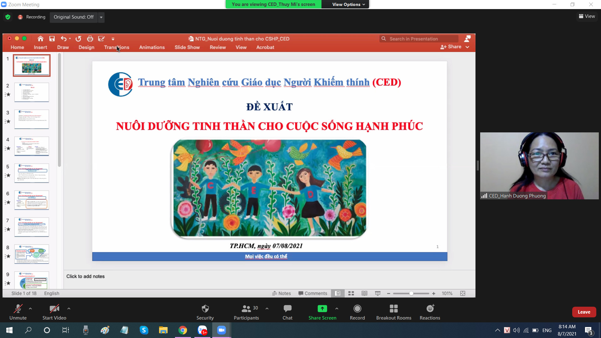 - Ngày 21/08/2021, Trung tâm Nghiên cứu Giáo dục Người khiếm thính (CED) đã tổ chức buổi sinh hoạt thứ hai trong hoạt động chuỗi sáu buổi sinh hoạt hàng tháng sau khóa “Bồi dưỡng Phiên dịch Ngôn ngữ ký hiệu” nhằm tiếp tục hỗ trợ, trau giồi kiến thức chuyên môn, kỹ năng thực hành và chia sẻ kinh nghiệm cho các học viên. Tham gia buổi sinh hoạt tháng 8 này có 22 học viên từ khóa tập huấn tháng 6, là giáo viên các trường chuyên biệt, phụ huynh và sinh viên ở nhiều tỉnh thành Hà Nội, Đồng Nai, Nha Trang, An Giang, Đồng Tháp, Đăk Nông, Đăk Lắc, TPHCM...